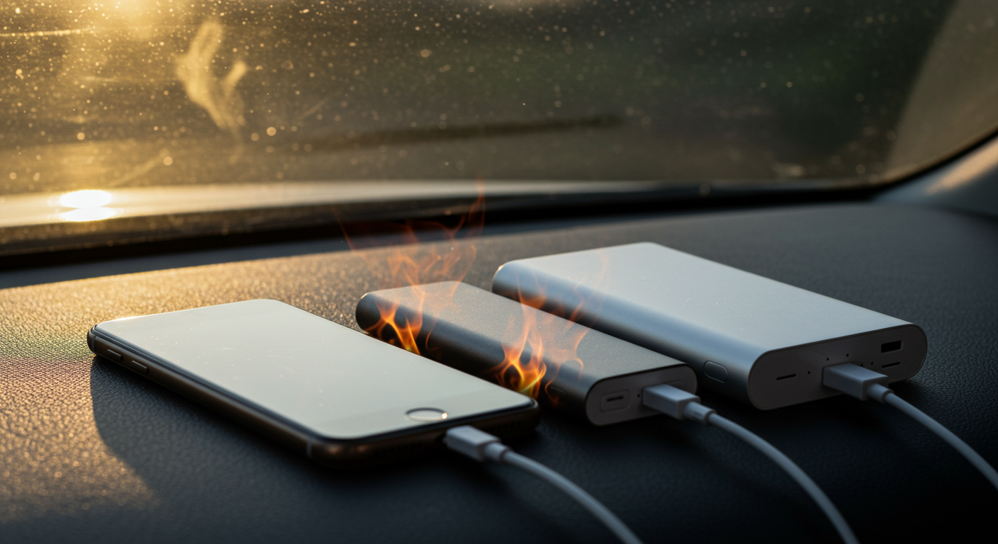 実際に、真夏日に車内に置きっぱなしにしていたモバイルバッテリーが発火し、車が全焼する事故も発生しました。気温30℃を超える車内では、機器内部が60~70℃に達することもあり、電池内部で化学反応が暴走する「熱暴走(サーマルランナウェイ)」が起こる恐れがあります。